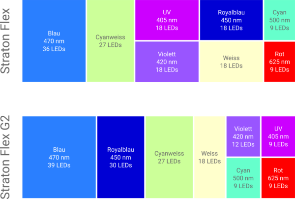 - Due to the large number of LEDs in different spectral colours, almost any spectrum can be produced